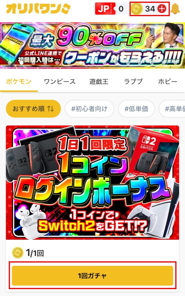 オリパワンの1コインログインボーナスで1コインで引くことができます。