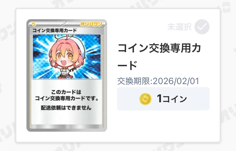 オリパワンのログインボーナスの4等は『コイン交換専用カード』になります。